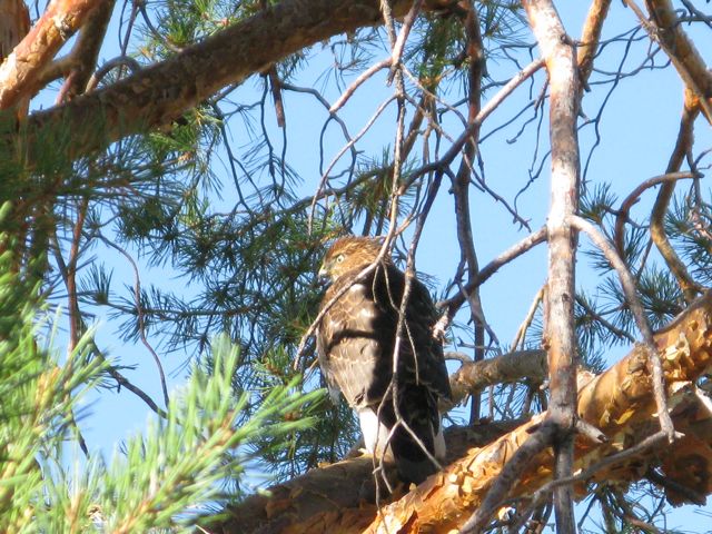 My husband took the bird off to a raptor rehabilitator, who checked out the hawk, a one-year-old female, and declared her sound and able to fly - and feisty as could be (her talons drew blood in the process). Then, we were instructed to release the hawk in our backyard, where it came from. When the box was uncovered, the hawk sat for a moment, looking around, then with a rush of wings, flew to the top of a tall tree, where it’s now resting comfortably and eyeing the view.