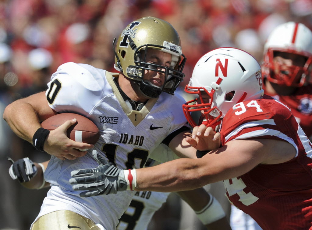 Nebraska’s Jared Crick (94) sacks Idaho quarterback Nathan Enderle for an 18 yard loss, in the second half of their NCAA college football game in Lincoln, Neb., Saturday, Sept. 11. Nebraska beat Idaho 38-17 in Lincoln, Neb. On Saturday, the Idaho Vandals nearly shut out UNLV of the Mountain West 31-7 in the Kibbie Dome, while Nebraska clobbered UWashington in Seattle 56-21. (AP Photo/Dave Weaver)