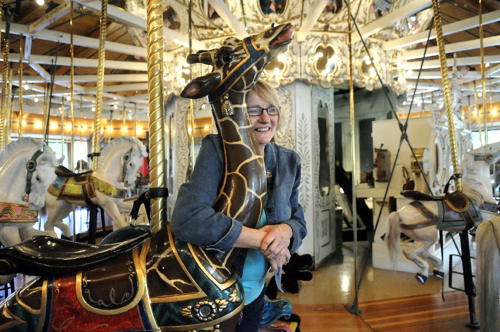 Wendy Kirbey, 66, of The Albany Brass Ring Historical Carousel & Museum Project in Albany, Ore., takes a break from a gathering of the National Carousel Association in Riverfront Park to interact with “Geri” the giraffe, featured on the Looff Carrousel.