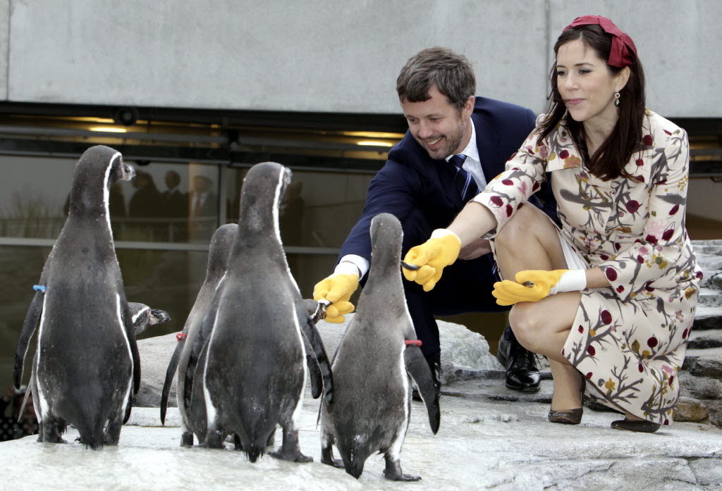 Crown Prince Frederik of Denmark and his wife Crown Princess Mary of Denmark feed penguins as they visit the aquarium in Stralsund, Eastern Germany today. You write the cutline. (AP Photo/dapd/ Jens Koehler)