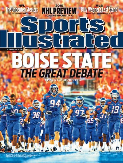 Here’s a news item from the Associated Press: BOISE, Idaho (AP) — The “firsts” keep coming for the Boise State football team. The third-ranked Broncos will be featured on the national cover of Sports Illustrated magazine this week. The Idaho Statesman reports that SI writer Austin Murphy spent much of last week in Boise to report and write a story about whether the Broncos should be eligible to play for the BCS national championship. Two photographers shot the Boise State-Oregon State game on Saturday night. Boise State was on a regional cover of Sports Illustrated’s college football preview in August, but this is the school’s first national cover. It hits news stands Wednesday. Boise State’s game against Oregon State also drew ESPN’s “College GameDay” show to Boise for the first time on Saturday. And the game against Oregon State was the first regular-season Boise State game to air nationally on network television.