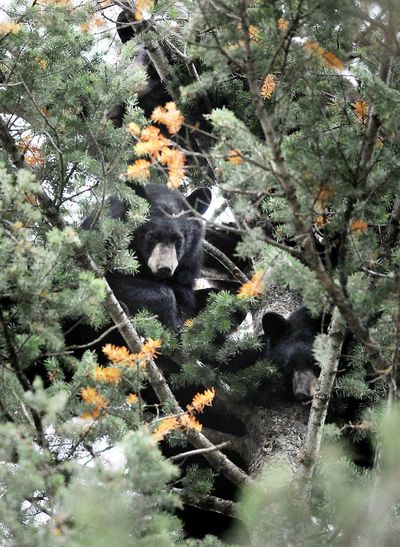 A mother black bear and two of her four cubs are visible in the upper branches of a pine tree in the front yard of Tom and Pam Gilbert on Sunday, northwest of Kalispell, Mont. (AP Photo/Daily Inter Lake, Brenda Ahearn)