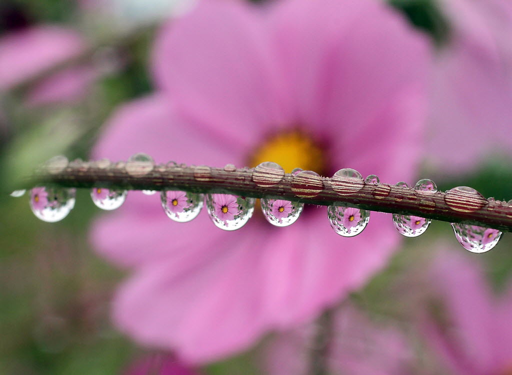 Flowers are refracted in the raindrops collecting on the stem of another plant in Blueberry Park in Bremerton, Wash., Monday. (AP Photo/Kitsap Sun, Meegan M. Reid)