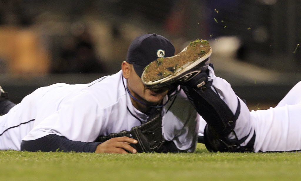 In this 2010 file photo, Mariners starting pitcher Felix Hernandez is kicked in the head by catcher Rob Johnson after the two chased a bunt from Baltimore’s Cesar Izturis in the fifth inning. Hernandez finished the game. Johnson is no longer with the club. But King Felix, the reigning American League Cy Young winner, will be on the mound tonight in Oakland as the M’s open their 2011 season against the Athletics. Here’s hoping that the Mariners don’t suffer another pratfall this season as they did last year.