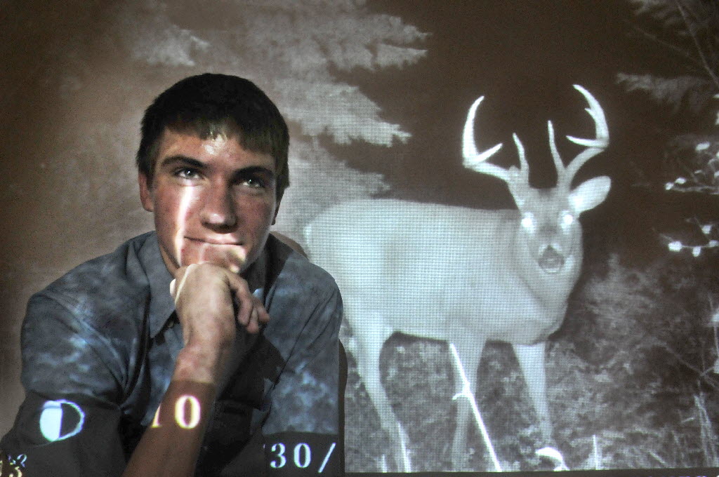 Erik Kemp stands in front of a slide from his science project at Riverside High School Tuesday. The senior at Riverside will present his school project, a survey of deer feeding habits, to a group of state biologists next week. He used a wildlife camera to observe deer feeding habits on his family’s land. Jody Lawrence-Turner story here. (SR photo: Jesse Tinsley)