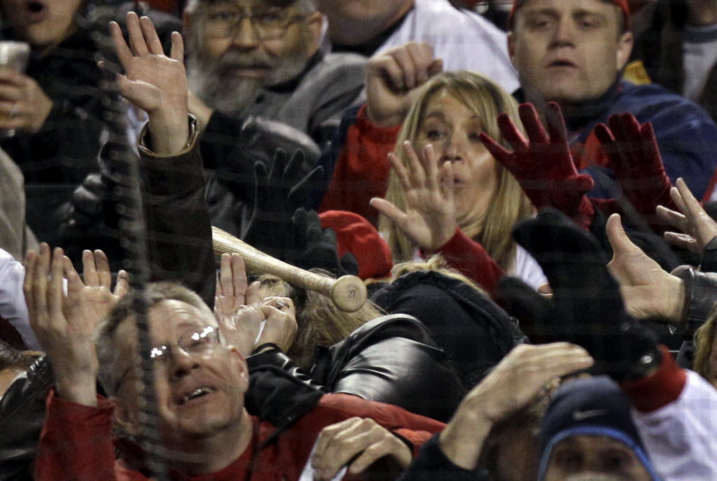 A fan is hit in the head by a bat accidentally thrown into the stands by St. Louis Cardinals batter Lance Berkman during the fourth inning of a baseball game against the Pittsburgh Pirates on Monday in St. Louis. (AP Photo/Jeff Roberson)