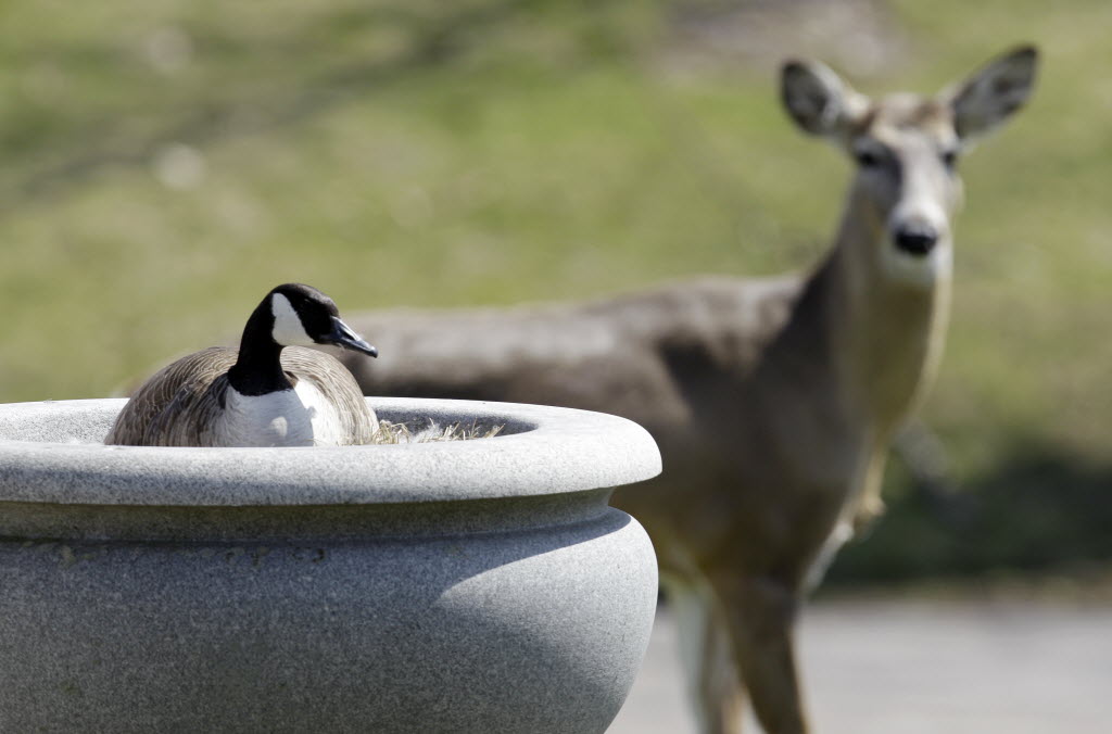 A deer watches over a goose nesting in an urn in a cemetery in Buffalo, N.Y., Thursday. For the past week or so, the deer has been standing near an urn where the goose has taken up residence, positioning itself between the urn and any car or foot traffic that passes by. You write the cutline. Story here. (AP Photo/David Duprey)