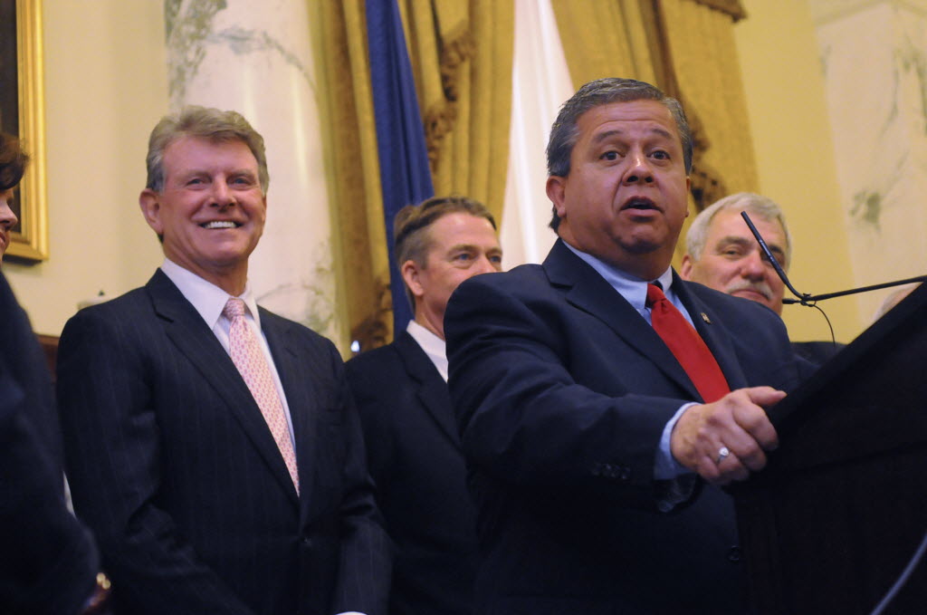 Idaho Gov. C.L. “Butch” Otter, left, smiles as state schools superintendent Tom Luna answers questions for the media during a news conference where the governor signed the third piece of the “Students Come First” legislation Friday in Boise. You can read Betsy Russell’s Eye On Boise story here . And see her story re: the referendum against Luna’s education reform below. (AP Photo/Idaho Press-Tribune photo: Charlie Litchfield)