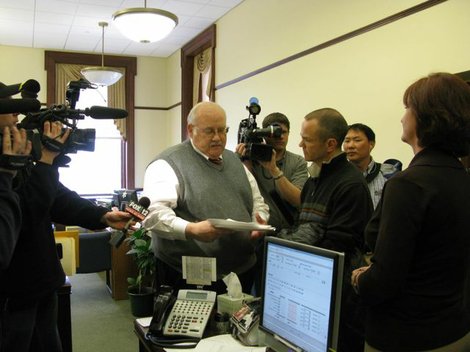 No sooner had Gov. Butch Otter signed SB 1184, the third major school-reform bill, into law, than a new group of parents and teachers calling itself “Idahoans for Responsible Education Reform” had delivered the preliminary paperwork to the Idaho Secretary of State’s office for a referendum seeking to overturn the new law. “Frankly, this is very much a parent-driven effort,” said Mike Lanza, a Boise father of two who’s joined Boise parent Maria Greeley to form the new group. Secretary of State Ben Ysursa received the documents and said, “We’ll expedite this … the clock is ticking”/ Betsy Russell , Eye On Boise. More here . (SR photo: Betsy Russell)