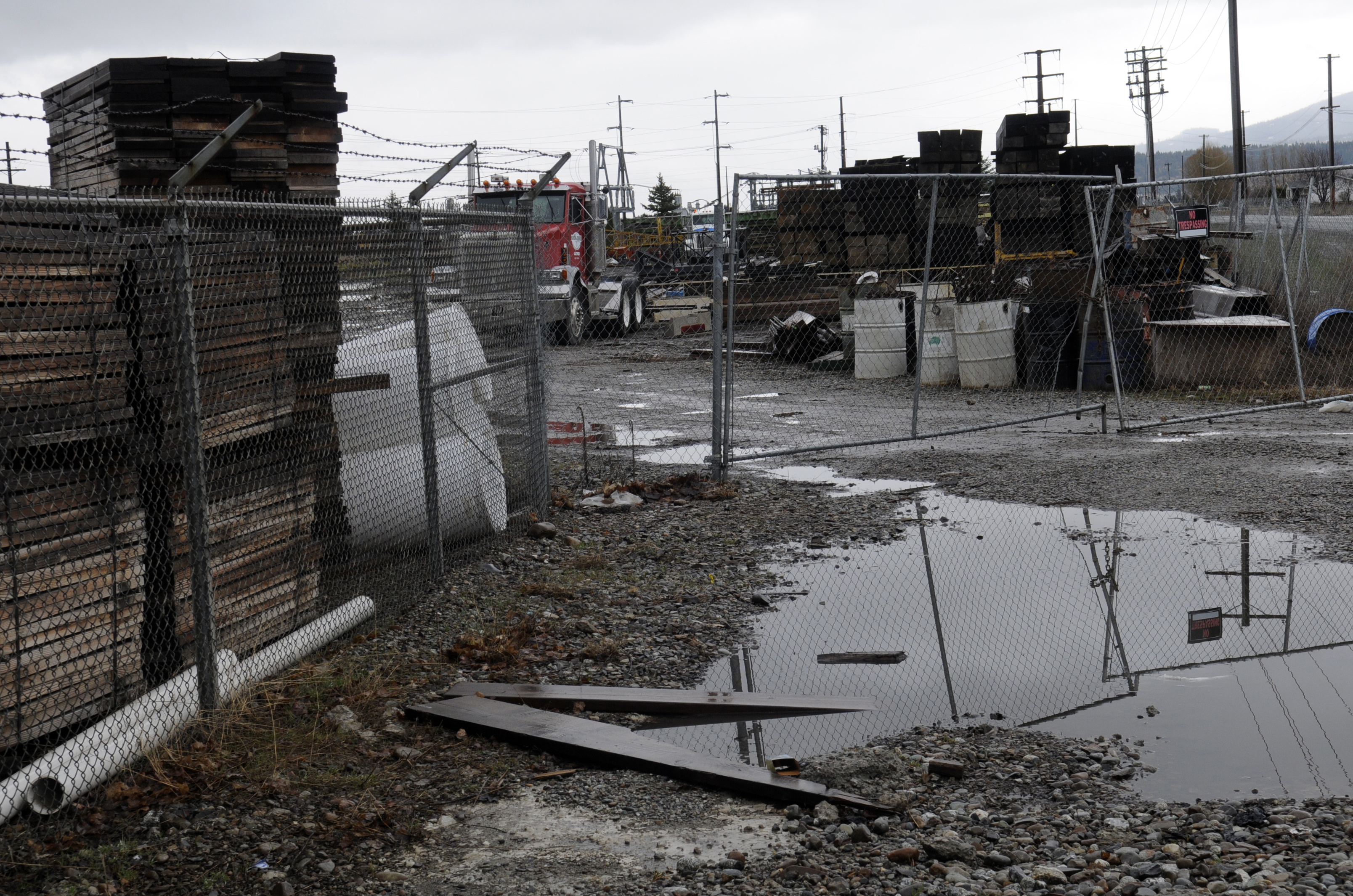 Construction on the Barker Bridge has been completed for almost a year, but the contractor, Morgen and Oswood of Great Falls, has yet to clean up the storage site owned by the Spokane Valley Fire Department at the corner of Barker and Euclid. SR photo/J. Bart Rayniak.