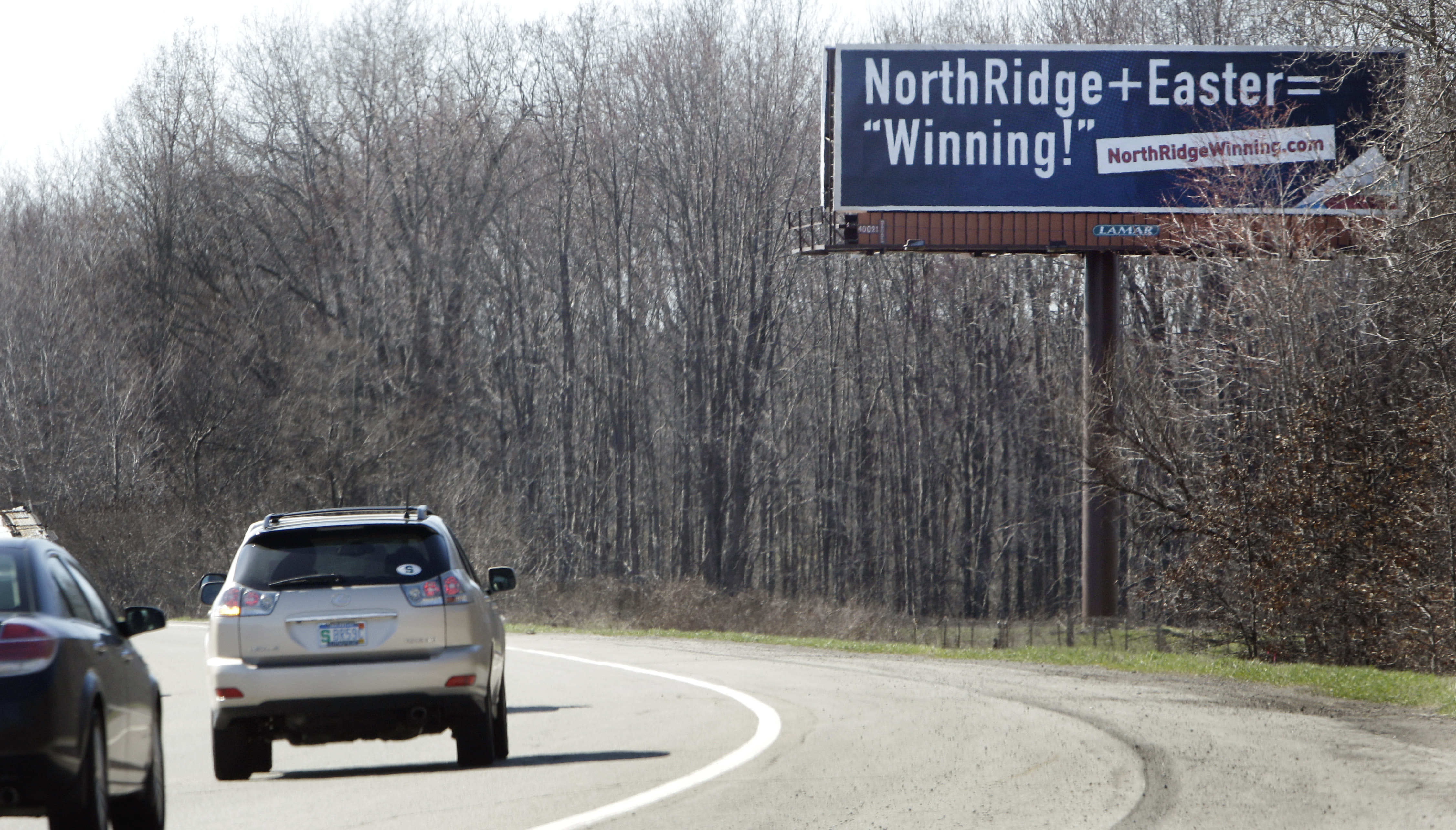 Vehicles drive by a billboard promoting Easter services, in Canton Township, Mich. A Michigan church has seized upon what it hopes will be a winning formula to draw more people to Easter services, thanks to a most unlikely source of inspiration: Charlie Sheen. The NorthRidge Church launched an ad campaign that features five freeway billboards, a series of online videos and a 160,000-piece direct mail blast to help draw worshippers. (AP Photo/Carlos Osorio)