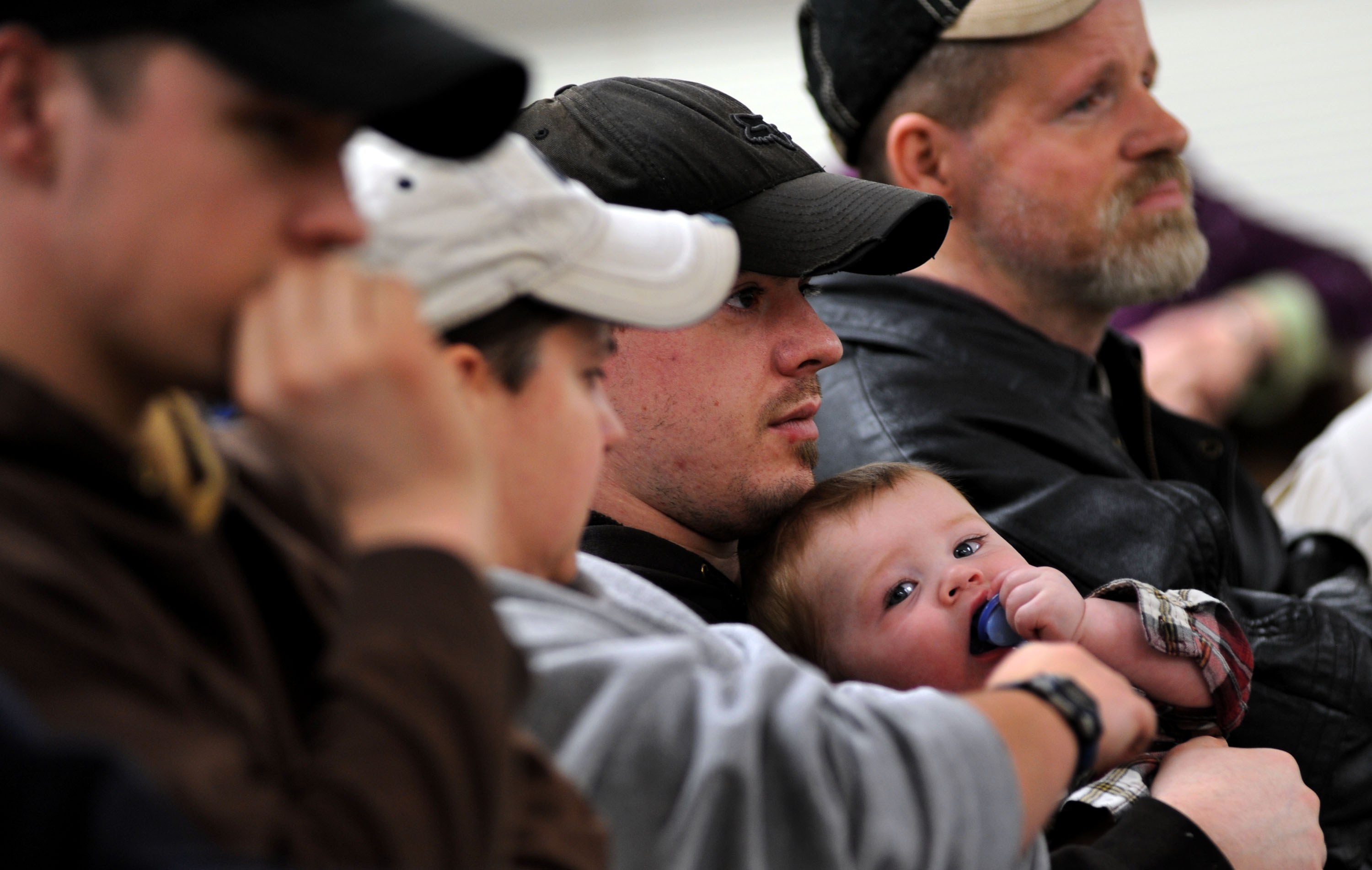 Lucky Friday miner, Brad Sala, of Mullan holds his 8 month-old-son Cael Sala during the press conference at Mullan City Hall today. One miner is still trapped in the mine after a cave in. (SR photo: Kathy Plonka)