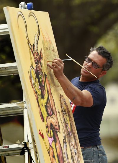 New York City artist Scott LoBaido works on his painting of famed military funeral protesters Fred Phelps and daughter Shirley outside the Westboro Baptist Church compound in Topeka, Kan., Sunday. LoBaido took a break from his 50 state tour of painting American flags on rooftops in each state to exercise his first amendment rights and finish his painting in the public spaces near the Westboro Baptist Church compound. (AP Photo/Orlin Wagner)