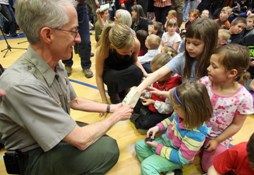 (AP file photo: Supt. Chas Cartwright of Glacier National Park, hands out new quarters to students of Canyon Elementary School during a ceremony held at Columbia Falls (Mont.) High School.