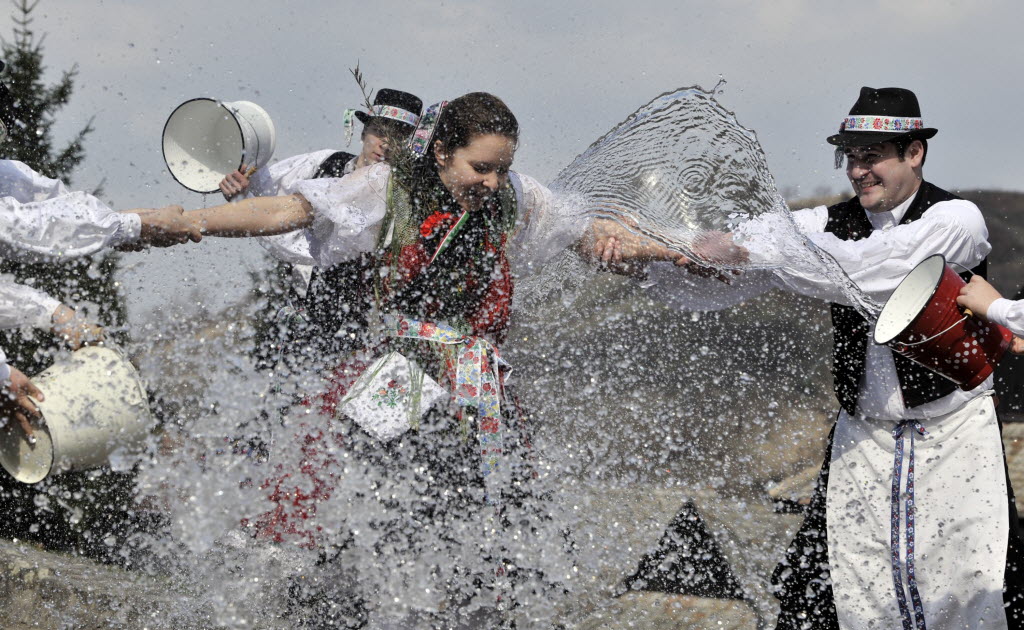 Boys of the Paloc minority, dressed in their traditional clothing, pour buckets of water on a girl in the village of Holloko, 100 kilometers (62 miles) north-east of Budapest, Hungary, Friday, during a practice performance of this typical Hungarian Easter tradition. You write the cutline. (AP file photo/Bela Szandelszky)