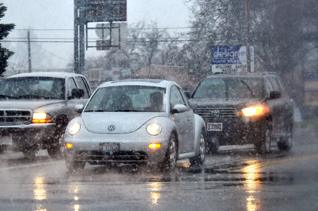 Cars move through a furious snow shower during the morning commute today in Post Falls. (SR photo: Jesse Tinsley)