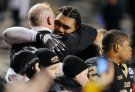 (In this 2009 Idaho Press Tribune file photo by Greg Kreller, Mike Iupati embraces Coach Robb Akey in closing moments of UI’s Humanitarian Bowl win over Bowling Green.)