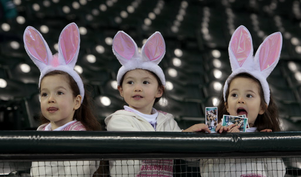 Twins Summer, left, and Autumn Adams, right, both 4, look on with sister Franchesca, 5, at the field as they all wear bunny ears in celebration of Easter before a major league baseball game between the Seattle Mariners and Oakland Athletics, Sunday, in Seattle. You write the cutline. (AP Photo/Elaine Thompson)