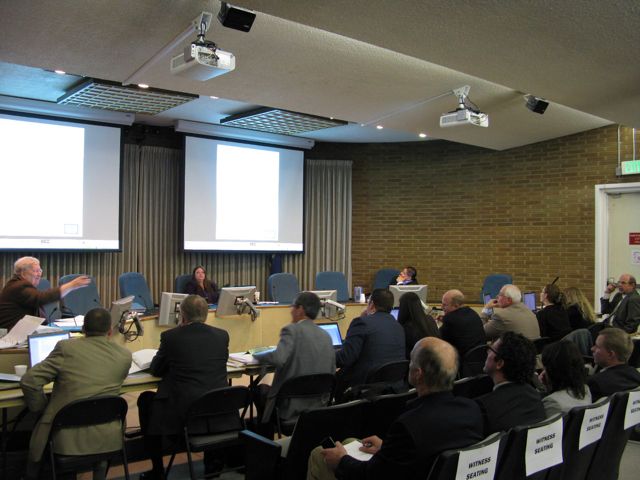 As the hearing got rolling, a wave of rain and hail hit loudly outside, and thunder rumbled noisily.