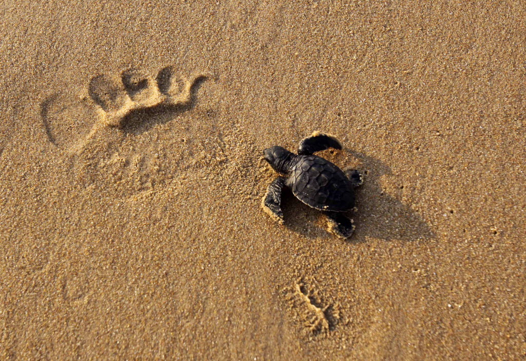A newly hatched baby Olive Ridley turtle wades to enter the sea, past a human footprint at the Rushikulya river mouth beach in Ganjam district, about 140 kilometers away from the eastern Indian city Bhubaneshwar, India, earlier today. You write the cutline. (AP Photo/Biswaranjan Rout)