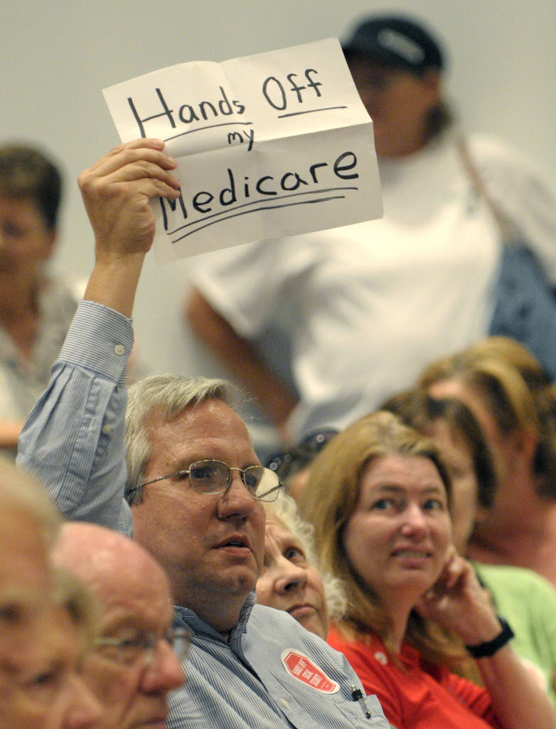 Jim Callahan, 52, of Orlando, raises a sign during a town hall meeting held by Rep. Daniel Webster, R-Fla., in Orlando, Fla., earlier today. Congressional Republicans are getting mixed reviews as they pitch their budget plan to constituents back home. Webster faced heckling, boos and shouting matches between supporters and opponents during an hour-long meeting. Webster defended the budget blueprint authored by Ryan that would cut social safety-net programs such as food stamps and Medicaid. Daily Kos report here. (AP Photo/Phelan M. Ebenhack)