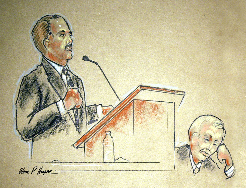 Assistant U.S. Attorney Marc Haws, left, delivers his opening statements in the trial against Edgar Steele at U.S. District Court in Boise today. Steele, an attorney who is well known for his defense of white supremacist groups, is accused of hiring a hit man to kill his wife and mother-in-law.