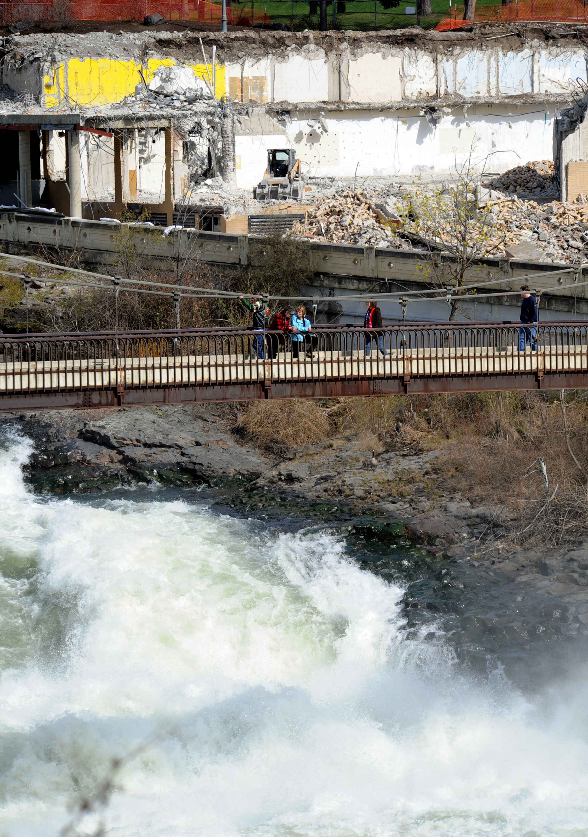 River on a tear down by Y: Strollers pause on the bridge to Havermale Island in front of the partially demolished YMCA to watch the falls on Friday. (Jesse Tinsley)