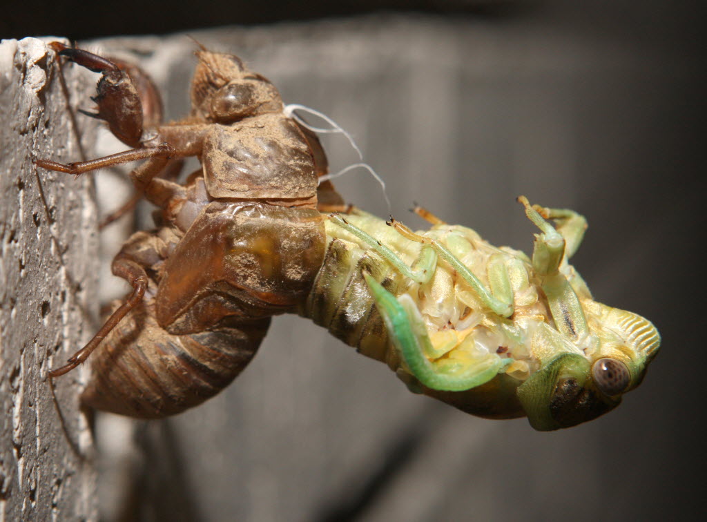 A cicada emerges from it’s shell which is attached to a brick of a home in Fort Smith, Ark. There are more than 1,500 species of cicada, but one of the best known is the periodical cicada that emerges from the ground every seventeen years. (AP/Photo/Times Record, Kaia Larsen)