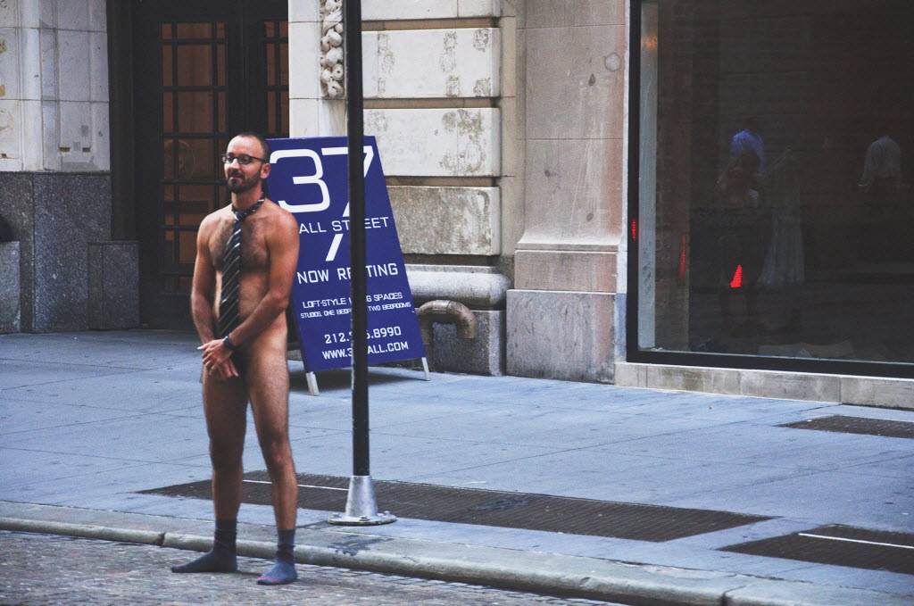 An unidentified man wears only a tie and socks as he participates in a performance art piece outside the New York Stock Exchange this morning in New York. For the five-minute piece, dozens of volunteers disrobed and acted out the motions of people at work. Police say they arrested two naked men and one topless woman for disorderly conduct. You write the cutline. Story here. (AP Photo/newcriteria.wordpress.com, Anthony Miler)