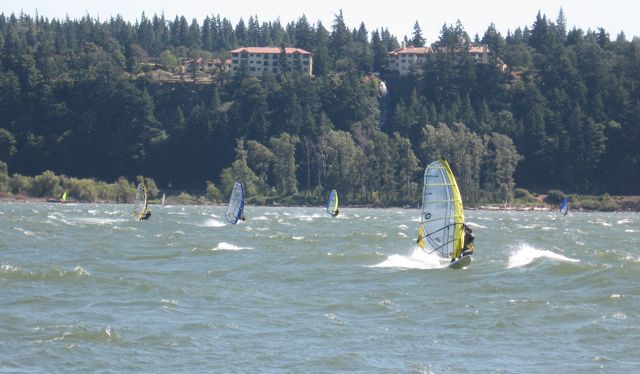 Meanwhile, no bunny suit here, I’m sticking with my wetsuit and enjoying the Gorge on my vacation this week. That’s me on the right, with the yellow sail, sailing today at the Hatchery; on the far shore is the Columbia Gorge Hotel in Hood River with its scenic waterfall down the cliffs.