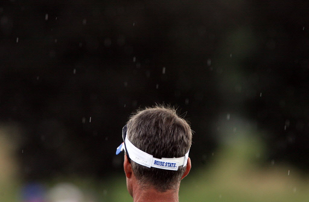 Boise State head coach Chris Petersen watches his team in the rain shower during NCAA football training camp Thursday in Boise. (AP Photo/Statesman: Joe Jaszewski)