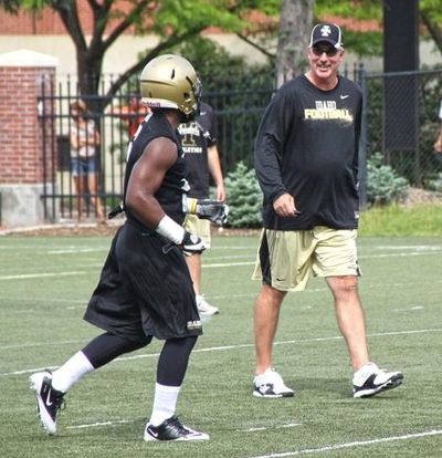 In this Facebook photo from the UI Vandal sports information desk, Coach Robb Akey congratulating running back Ryan Bass on a great punt return during the Vandals first practice this week. You can read Josh Wright’s stories about that practice here. And: More photos of practice here.
