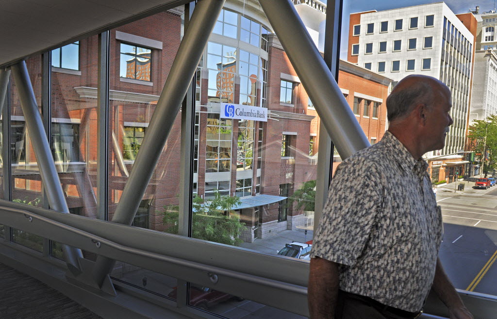 Rick Melanson crosses the Riverside Avenue skywalk as a new sign on the front of the former Bank of Whitman building in downtown Spokane announces the change to Columbia Bank on Monday. The Tacoma bank is seeking to be stabilizing influence after Whitman’s seizure by FDIC. John Stucke SR story here.