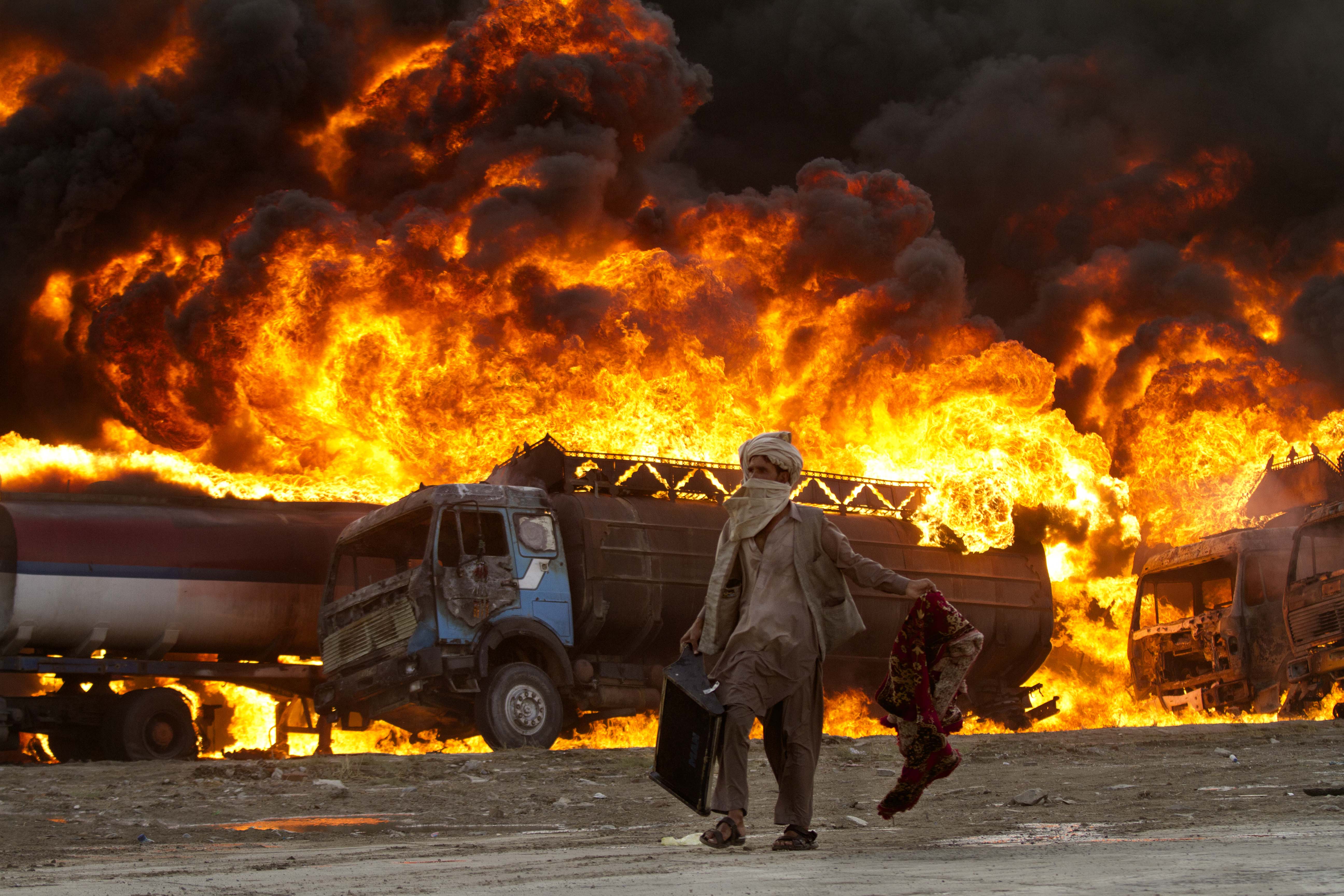An Afghan carries his belongings as he passes burning fuel tankers in the outskirts of Kabul, Afghanistan, Thursday, Aug. 4, 2011.