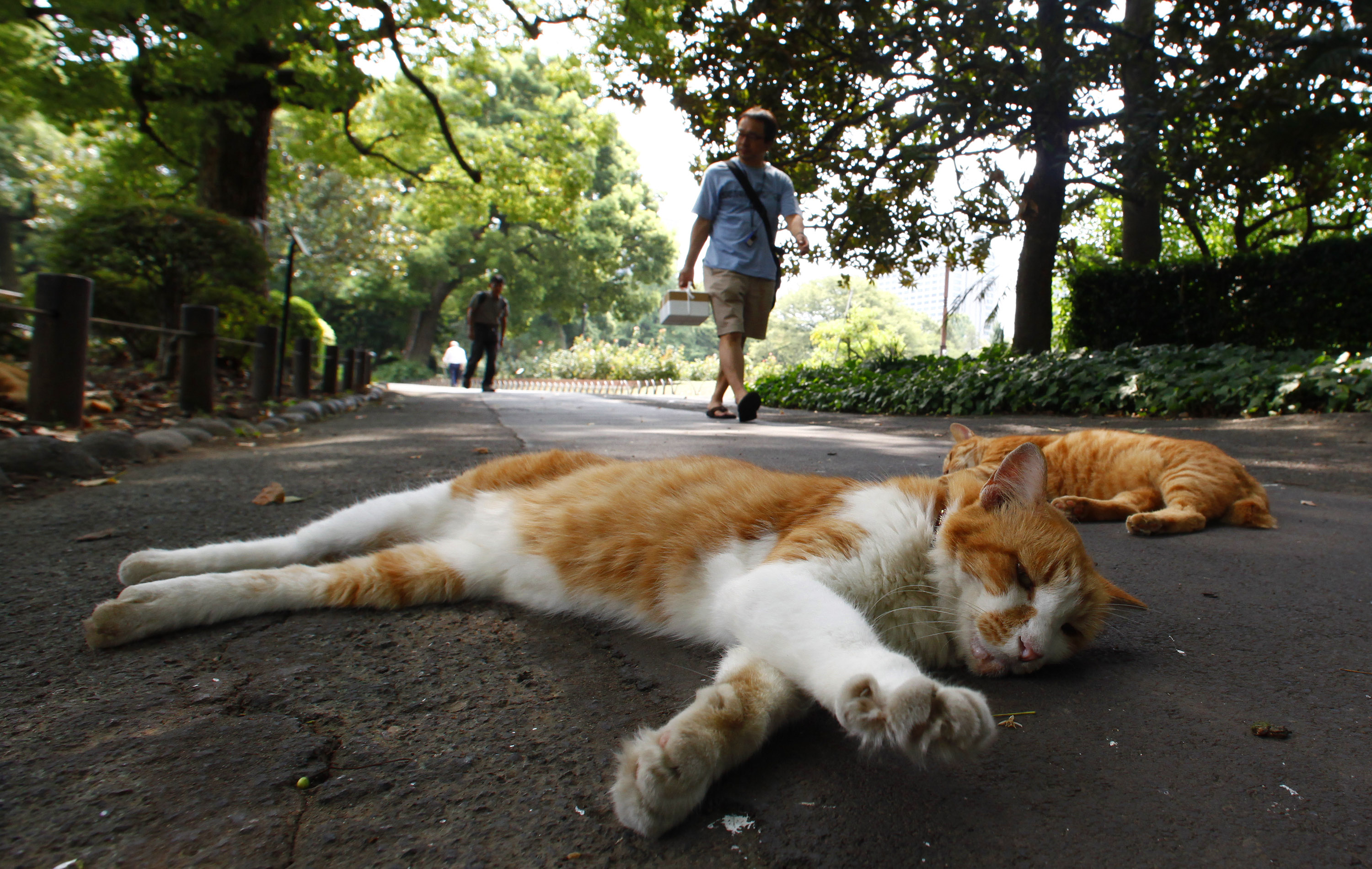 Cats take a nap in a park in Tokyo in the early afternoon Tuesday, Aug. 16, 2011.