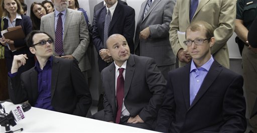 Damien Echols, left, Jessie Misskelley, Jr., center, and Jason Baldwin sit at a table before a news conference at the Craighead County Court House in Jonesboro, Ark., Friday after the three were released after pleading guilty to the 1993 deaths of three West Memphis, Ark., children. (AP Photo/Danny Johnston)
