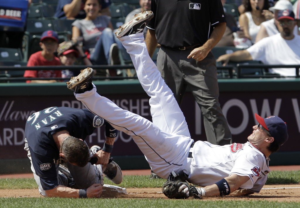 After retrieving a high pick off throw from Cleveland Indians catcher Carlos Santana, Indians third baseman Jack Hannahan flips over Seattle Mariners baserunner Brendan Ryan as he steals third in the fifth inning of a baseball game in Cleveland today. The Mariners are leading Cleveland 9-2 in the top of the 9th, behind the pitching of Felix Hernandez. Boxscore here . (AP Photo/Amy Sancetta)