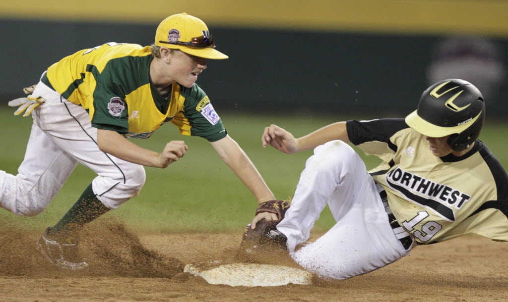 Huntington Beach, Calif.’s Trevor Windisch, left, doesn’t get the tag down in time as Billings, Mont.’s Patrick Zimmer (19) slides safely into second base with a sixth-inning double during a baseball game at the Little League World Series in South Williamsport, Pa., Wednesday. Montana won 1-0 in seven innings to advance to U.S. finals. Story below (AP Photo/Gene J. Puskar)