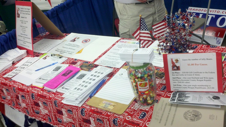 A Berry Picker sends this photo of the Kootenai County Reagan Republican booth at the North Idaho Fair this afternoon, with the note: “No bumperstickers.” I’m not surprised. But “Corrupt d’Alene” bumperstickers were there opening day b/n 4-5:30, according to a reliable Berry Picker and her mother who passed by the booth on several occasions to check them out. Although KCRR poohbah Jeff Ward denies that the stickers were there at all, he does describe to the notion that Coeur d’Alene is corrupt.
