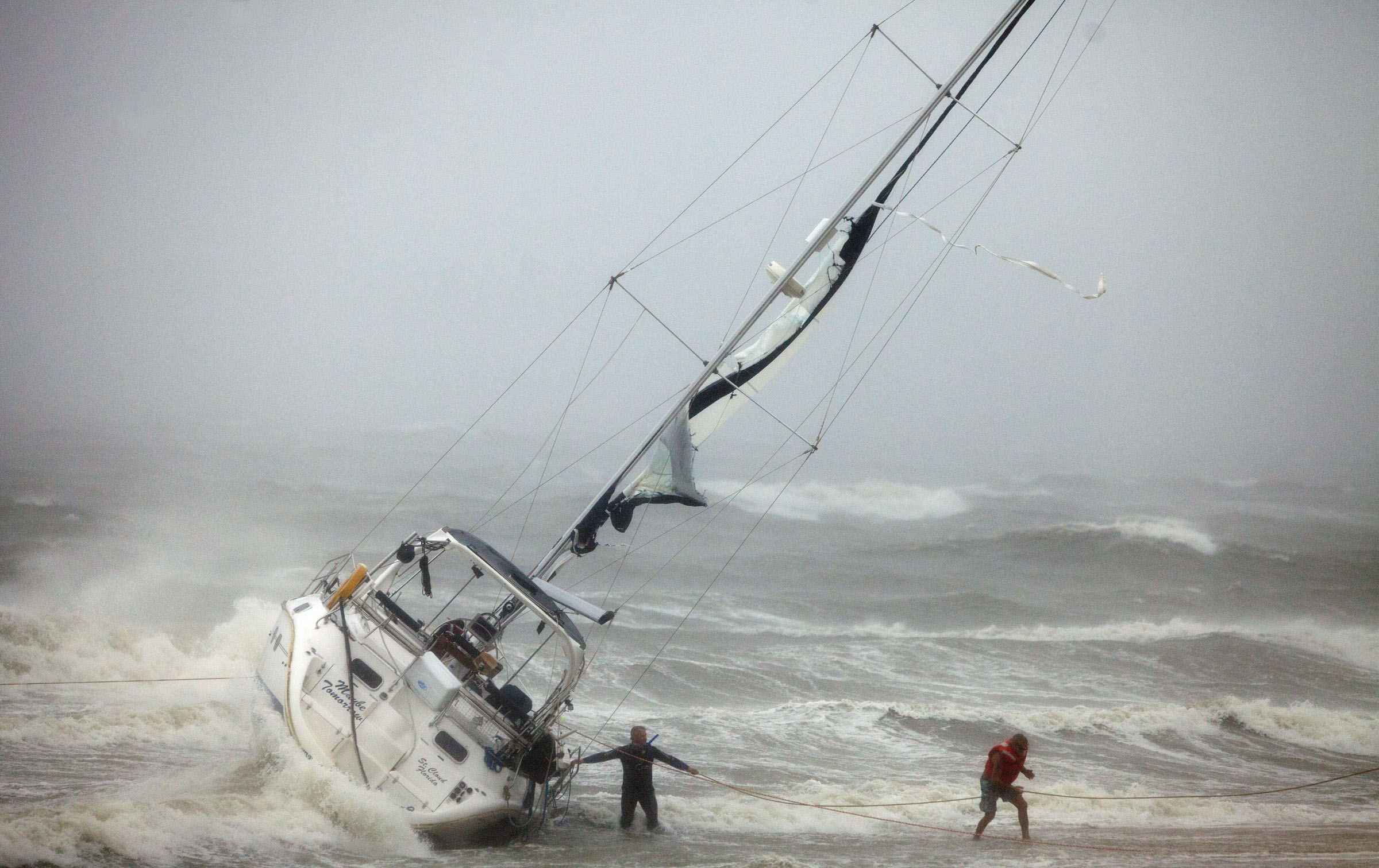 One of two people rescued from a sailboat, right, uses a line to make their way onto the beach on Willoughby Spit in Norfolk Saturday morning after they and another person were rescued from the boat that foundered in the waters of the Chesapeake Bay during Hurricane Irene. A rescuer, left, waits for s second person to exit the boat. (AP Photo/TheVirginian-Pilot, Bill Tiernan)