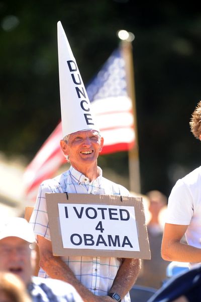 Wearing a dunce cap, Don Bahl attends the Tea Party Express tour kick-off in Napa, Calif. on Saturday. Bahl said he voted for President Barack Obama in the last election but didn’t get the change he wanted. You write the cutline. (AP Photo/Noah Berger)