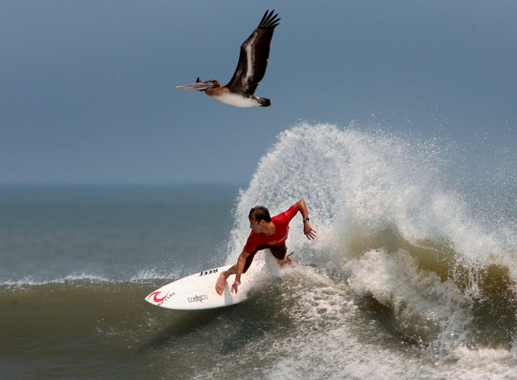 Surfer Tayler Brothers, of Osprey, Fla., catches a wave as a pelican rides the updraft of the surf in Ponce Inlet, Fla., Saturday. Surfers flocked to the beach to catch the remnant waves of Hurricane Irene. (AP Photo/Daytona Beach News-Journal, Nigel Cook)