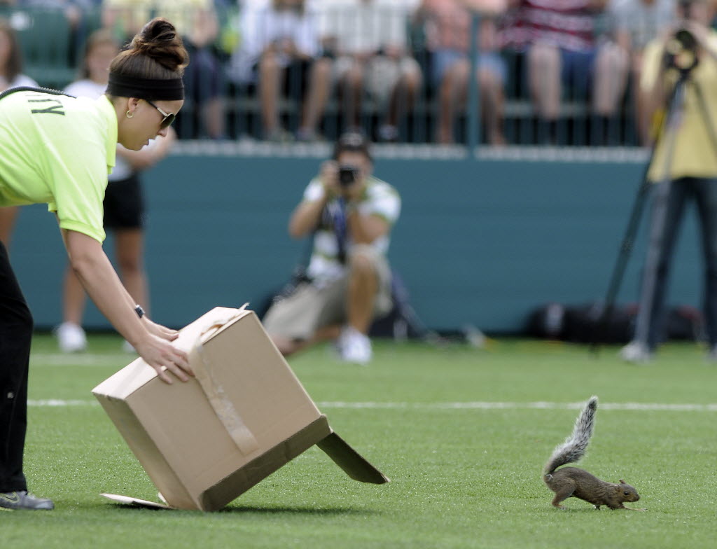 A worker tries to trap a squirrel on the field during the WPS championship soccer game between the Western New York Flash and the Philadelphia Independence in Rochester, N.Y., Saturday. You write the cutline. (AP Photo/Dan Cappellazzo)