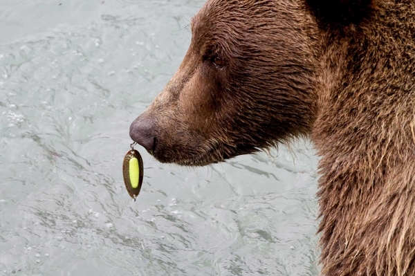 Alaska brown bear finds nose jewelry in tackle box