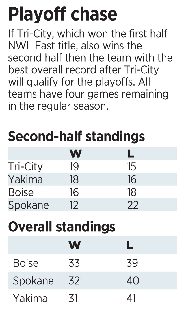 If Tri-City wins the second-half title and finishes ahead of Yakima, and Spokane and Boise finished tied overall, the Indians have the tiebreaker based on – believe it or not – a better divisional record in the second half.