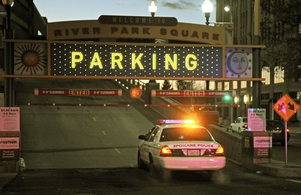 A Spokane Police Department car blocks the entrance to the RiverPark Square parking garage Tuesday after reports of someone falling onto the entrance ramp. Story here (fourth item) . (SR photo: Christopher Anderson)