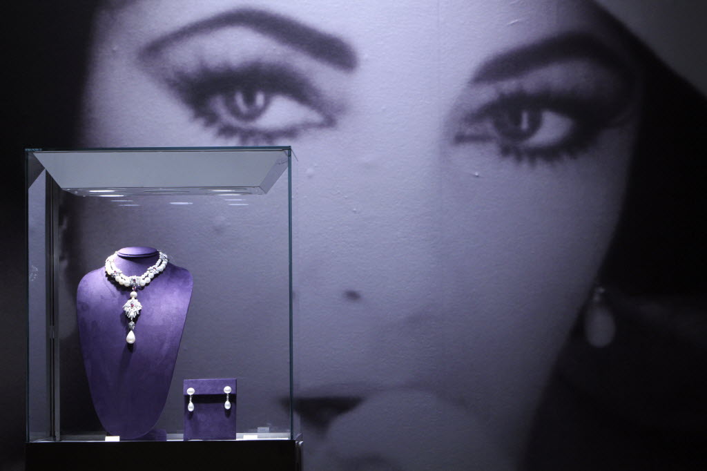 La Peregrina, left, a Natural Pearl, Diamond and Ruby necklace by Cartier, and a pair of Natural Pearl and Diamond ear pendants by Bulgari are on display during a preview of the full Collection of Elizabeth Taylor at Christie’s today in New York. The collection will be up for auction in person and online, a first for Christie’s, from Dec. 13-17. (AP Photo/Mary Altaffer)