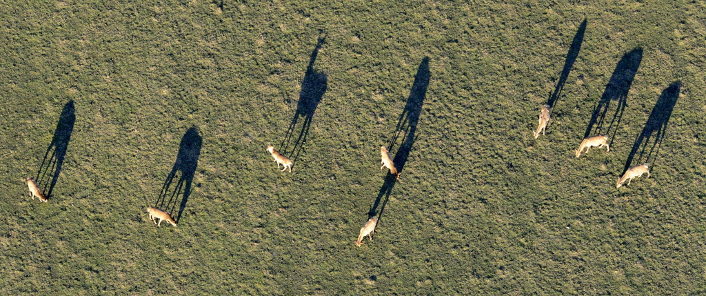 A group of female Red Deer cast their shadwos across the ground while grazing in a field along Pinnacle Drive, Catawissa, Pa., late Thursday afternoon at the Rolling Hills Red Deer Farm. The Red Deer is the fourth largest deer species in the world and the farm has over 400. (AP Photo/Bloomsburg Press Enterprise, Jimmy May)