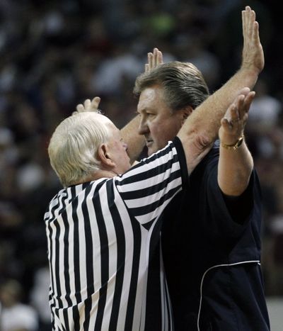 West Virginia basketball coach Bob Huggins, right, and official Tim Higgins compare allowable blocking movements in the second half of their NCAA college basketball game in Starkville, Miss. You write the cutline. (AP Photo/Rogelio V. Solis)