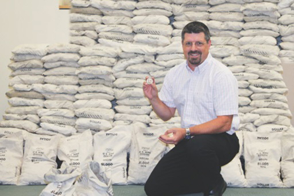Ken Westover poses in front of bags of Eisenhower silver dollars at the company in Littleton, N.H. The company acquired nearly a quarter million of the silver dollars that had been sitting in a basement vault of a Montana bank for more than thirty years. Helena Independent-Record story here. (AP Photo/Littleton Coin Company, Stephanie Westover)